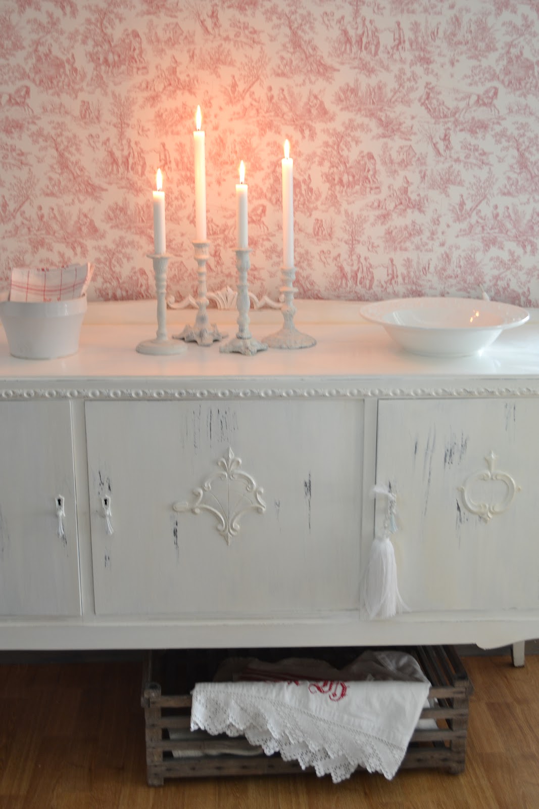Jättehärlig tapet och vad fint du har fått skänken! Tar tacksamt emot tips hur du har målat den. Har själv ett stort skåp som jag vill "shabba"